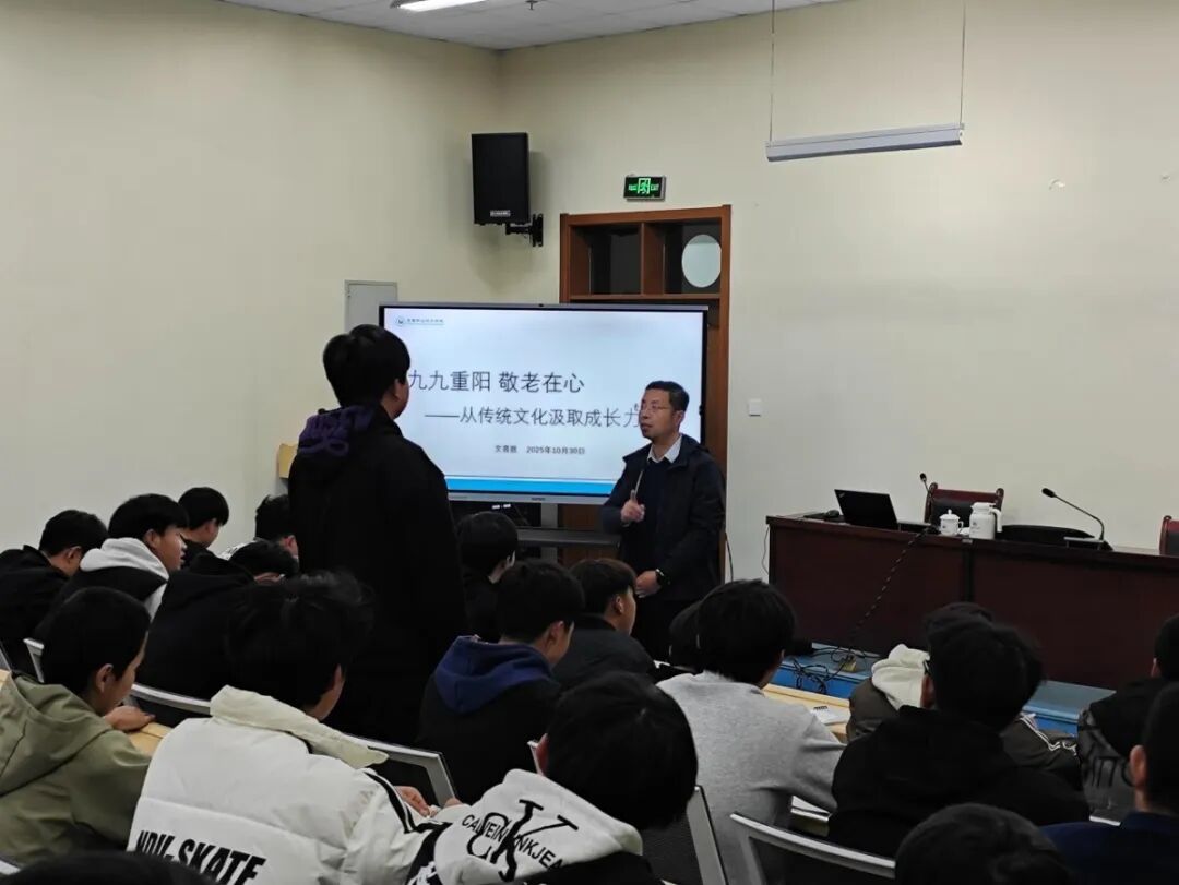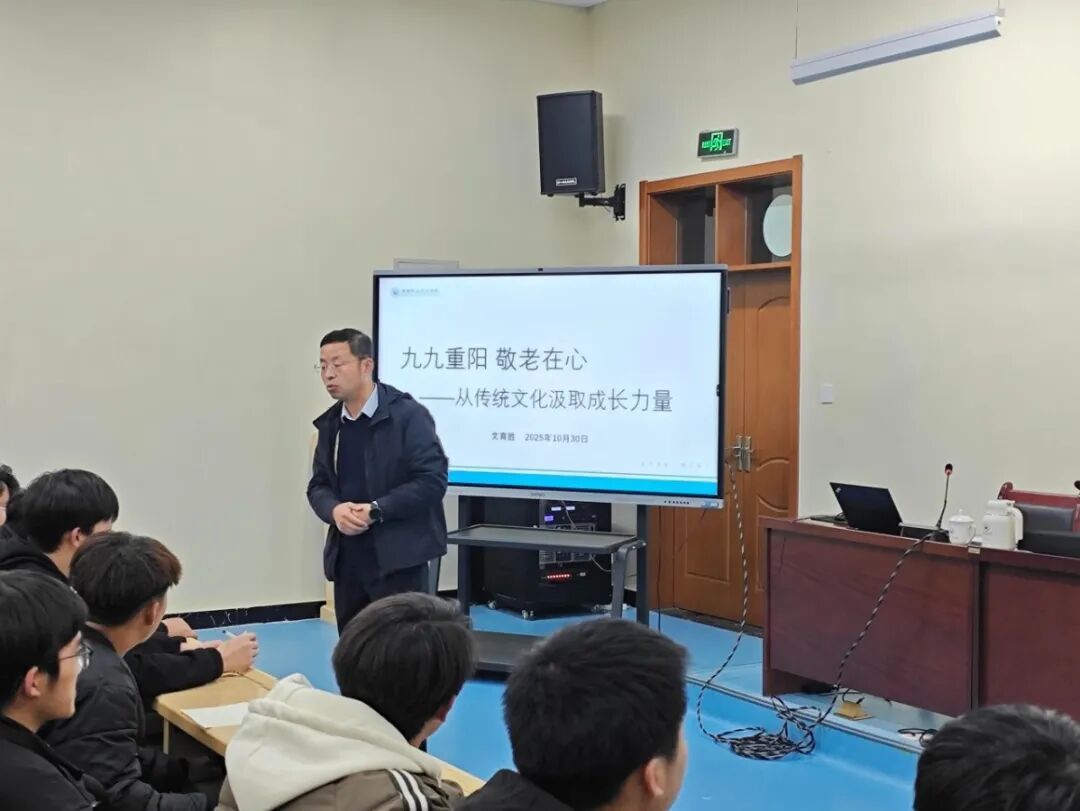 上课伊始,文育胜以“提到重阳大家会想到什么?”的问题引入,为同学们解读了重阳节的文化底蕴与发展脉络:农历九月初九,因《易经》中“九”为阳数,双阳相重故得名“重阳”。从先秦时期的祈福避灾,到东汉形成固定习俗,再到如今以敬老、祭祖为核心的文化内涵,同学们在短短几分钟里,便触摸到了这个传统节日跨越千年的历史温度。